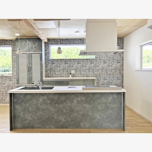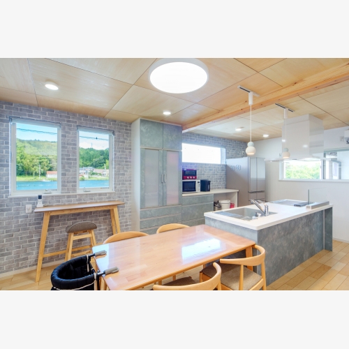 DKと隣接する茶の間(和室)を使って開放的に大改造。 タテの空間を生かしたキッチンの配置で奥様の動線を短くスムーズに。 現地調査で気が付いた窓外の景色の良さ。リフォーム前は眺めるような窓ではなかったので、ゆっくり眺める窓をプラン。 また、キッチンからリビングが見れたり、壁一面にマグネットが使える壁材を貼るなど、ママに嬉しい場所に。