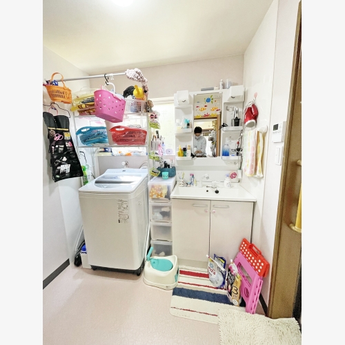 システムバスからの取替。お手入れ重視でカウンター等は無しのスッキリタイプ。 リフォーム前の洗面脱衣室は廊下からとDKからの2カ所入口がありました。そのため脱衣室が通路になってしまい窓側しか収納できない状態でした。そこで入口をDKからの1カ所にして廊下側を壁にして収納家具を置けるように。いままでと部屋のサイズはほとんど変わらないけれど、工夫により格段と収納スペースが増えました。