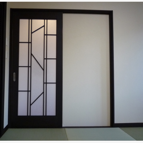 吊って、洋間に和要素をプラス。サッシ回りや木部は黒茶に塗装をし、モダンな雰囲気にチェンジ!クロスにはアクセントに、柿色のオレンジを差し色に加えた。建具は、ちょっと変わったデザインのものを!というご希望で、竹をイメージした建具をデザインし製作した。