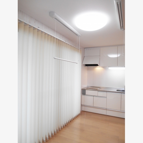 ミニキッチンを設置したスペースは普段開け放して使うが、友人などが集まったときは仕切れるように3枚引き戸を設置。またここはベランダから洗濯物がすぐ取り込めるように、天井に2機のホシ姫サマ(昇降式干し竿ユニット)を取り付けた。また天気が悪いときはここが室内干し空間になる。