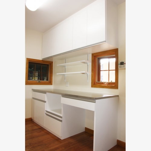 ●キッチンの後ろにキッチンと同じ奥行き、カウンターの高さの作業カウンターをつくり作業スペースを確保。