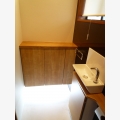 ・ペーパー等のストックをしまう収納家具を設置。カウンタータイプで、上部には鏡を。