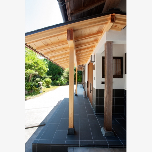 屋根がちょうどよい高さになったおかげで、夏場は玄関内がとても涼しくなり、雨の日は玄関を出てすぐ濡れることもなくなりました。