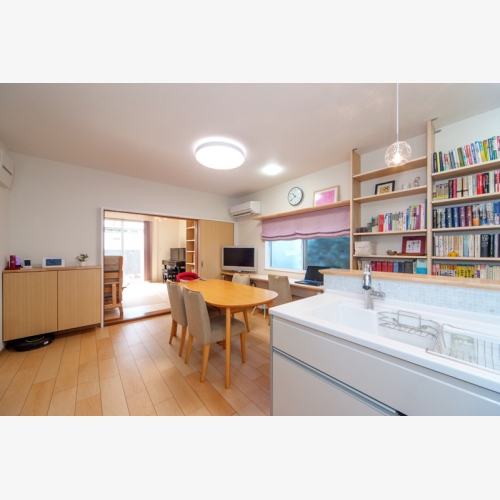 2×4なので、大きな間取り変更が難しく、今の間取りを生かして本棚スペースとキッチン、ダイニングスペースを配置しました。