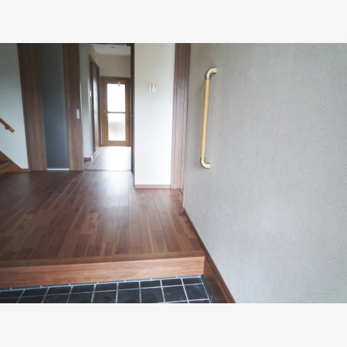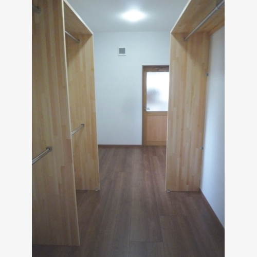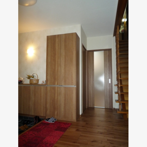 玄関を入ると暗いイメージがあったので、玄関正面は勝手口ト゛アを付け明かりや風が通るようにした。直接見えないよう、建具で仕切ってある。下駄箱収納は、システムタイプを使い、たくさんしまえるように。また、玄関からLDKへの入口付近には、カバンやコートが掛けれるよう、クローゼットをつけてあります。
