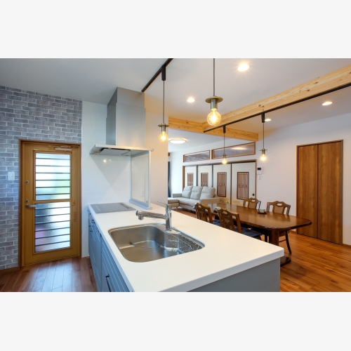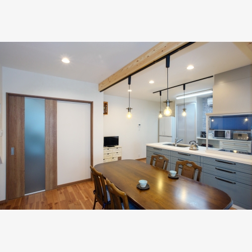 奥様ご希望の対面キッチンは、ペニンシュラ型でIH前もガラス張りで、家族の様子が見渡せるように。一目惚れしたキッチンの扉材に合わせ、照明などもご提案。キッチンのダイニング側は引き出し収納になっているので、小皿などの食器はもちろん、食品のストックや薬などもしまっておけます。