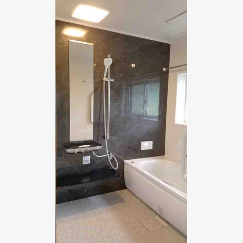 1.25坪のユニットバスに大きいミラーのカウンタータイフ゜の洗面台を採用。収納もたっぷり入る洗面台は、カウンターが伸びていることで、メイクスペースや脱衣かごを下部に収納できたりできます。