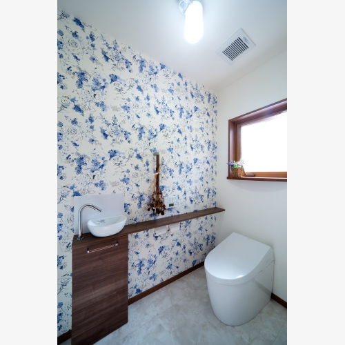 大小2つに分かれていたトイレ。家族や来客用のトイレは、ブルーの花柄がアクセントになった、爽やかな トイレに。
