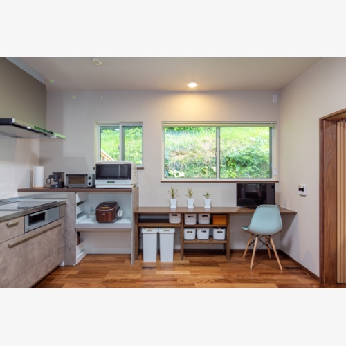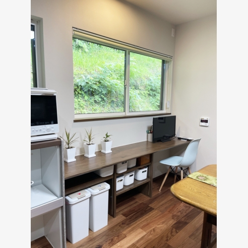 ・家電収納カウンターの延長線上に造作カウンター設置。下部は自由に収納できるよう可動棚をつけ、ごみ箱などをしまってもらった。家事の合間の休憩に、外を眺めれる休憩場所として使うのもいい。