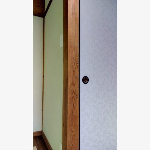 ・玄関の正面にある建具の開口部を、半間分の奥行を玄関側へ出した。半分こずつ食器棚・飾り床にし、新たな入口ドアを設けた。視線を飾りに向けることで、中の様子よりも飾りに目が行くようにした。