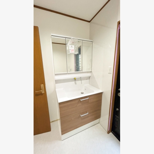 洗面が壁に接していると、どうしても水はね等で年々汚れてきていますよね。そんなお悩みを、壁にパネルを貼って、毎日の拭き掃除がしやすくしました。またワンサイズ大きくした90㎝幅の洗面台は、引出しや三面鏡に収納できるようにして、洗面に物を置かないで済むようになりました。