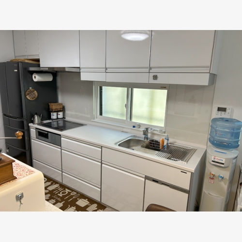 リフォーム前は、ダークブランのパントリー付きのシステムキッチンでした。また床色も濃かったので、部屋全体が暗い雰囲気でしたが、ナチュラルカラーの床材とオフホワイトのキッチンやクロスで、雰囲気を明るく変えることができました。巾木や枠は既存の色が残ってしまいましたが、コストダウンには繋がりました。窓もコストダウンのため変えてはいませんが、内窓を取付け断熱もしました。