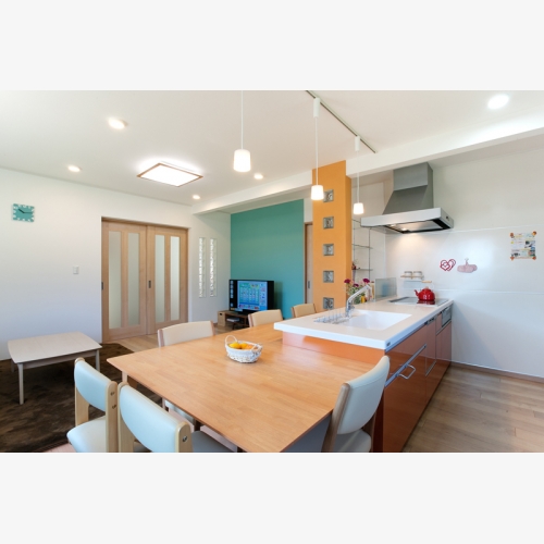 LDKにはやや狭い空間を開放的にするため、キッチン正面の壁を開口しホールのプレイルームも目が行き届く間取りへ。デザインに明るいご主人と共に建具に合わせたアクリルブロックでの明かり取りや取れない柱をモニュメントにするなどのご提案が実現し、お客様に恵まれたと感謝しています。