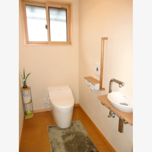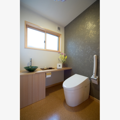 来客用トイレ 奥さまこだわりの焼物の手洗いボールに合わせてトイレ空間をコーディネート。 見た目の印象もがらりと変わり、機能性も備えた、おもてなしトイレの完成。 安心して使っていただけるよう、手すりやカウンターも設置。