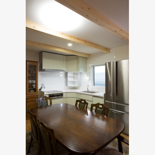 お二人でお使いになるキッチンは、奥さまのキッチンでの動線を、なるべく短縮することを考えた。 A型キッチンはとてもコンパクトな家事動線となる。(※現在は販売されておりません)食器棚や家電・冷蔵庫も1~2歩で届く距離に配置した。天井には飾りの集成梁を入れ、アクセントに!