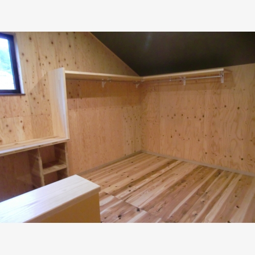 寝室に入りきらない衣服やおもちゃを置いていた子供部屋。建具と窓に四方を囲まれ、家具がおきにくく、冬は寒い。 以前のDKを子供へ屋に変更。子供を裸足で・・・という希望から、30㎜の無垢杉のフロアと天然塗料を使用。傷はつきやすいが、踏み心地が柔らかく、あたたかい。 絵やパズルなど飾れるように子供部屋の壁も構造用合板で仕上げた。