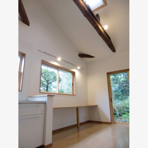 ◎狭さを感じないよう、天井を顕しにして空間を広げた。また、トップライトをつけ、上部か