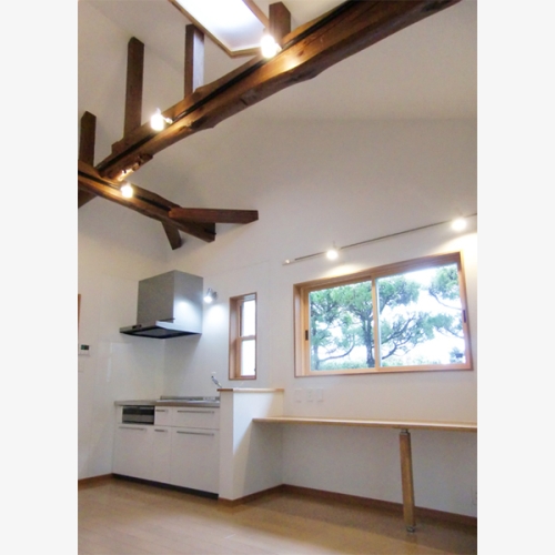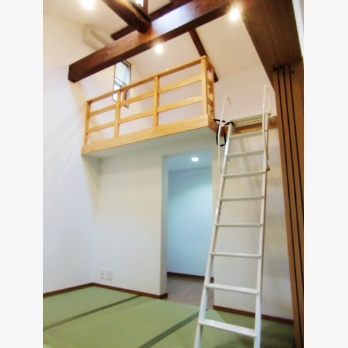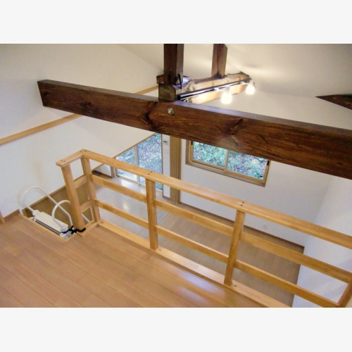 面積に限りのある平屋。小屋裏の高さがとれそうだったので、子供に人気のロフトを計画。 しっかりた材料でつくられていたので梁は磨き塗装で化粧。 ロフトの下は、布団や衣類をしまう3帖強のクローゼットになっている。