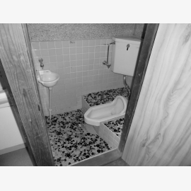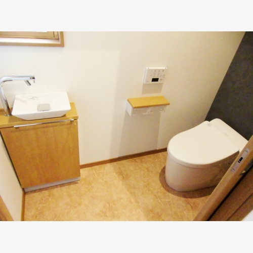 和式のトイレ空間は狭いので、広く計画しました。手洗いはお子様でも使いやすいよう、大きめのボールになっています。