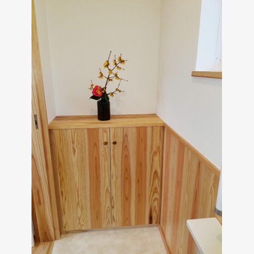ユニットバス・トイレだったため、年齢と共に使いにくくなってきたそうだ。将来のことも考慮して、バス・トイレ別を希望。天井材に使った杉板をトイレの腰板にも使い、ゆったりとしたトイレ空間に仕上げた。