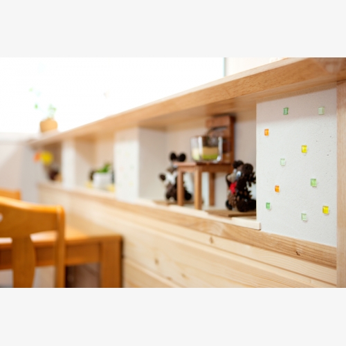 奥様のイメージでキッチン対面の壁を明るい無垢板と珪藻土、予め伺っていた「好きな色」でちりばめたモザイクタイルでデザインしました。