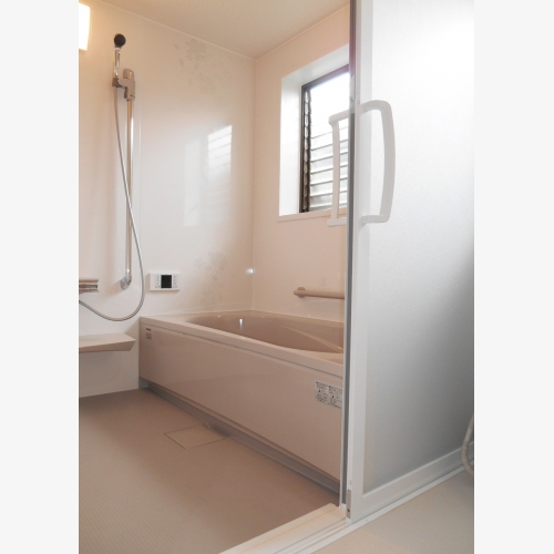 一坪サイズのお風呂を設置するため、少し狭くなった洗面脱衣室。 ミラーの後ろも収納ができる洗面台に取替、狭さを感じないスッキリした脱衣室になった。 お風呂はゆったりとした1坪サイズへ。お手入れがラクなすっきりしたタイプのお風呂を選ばれた。