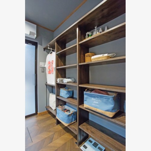 リフォーム前のシステムバスと広さは同じだが、心安らぐ仕掛けが組み込まれたTOTO「シンラ」へ。 ヘッドレストが付いた浴槽とお湯で肩と腰を包み込む楽湯で心地よいリラックスタイムが楽しめる。 無垢扉の洗面台とモザイクタイルと床には水に強いタイプの加工がされたフレンチヘリンボーンで上質な空間を演出する脱衣室。 壁一面に作り付けた可動棚も家族それぞれの収納に役立っている