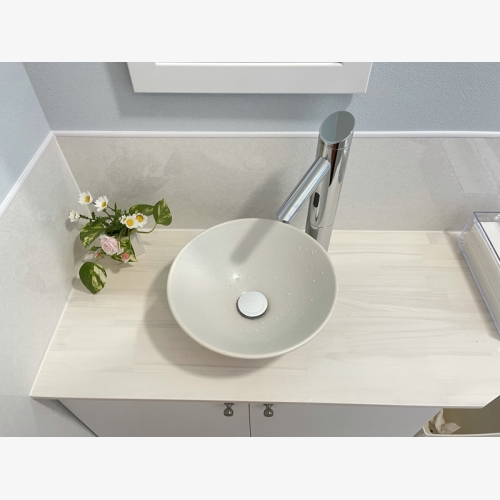 ●小便器を撤去し、木工で製作したカウンターとキャビネット、陶器製の手洗い器とタッチレス自動水栓を組み合わせて、機能的ながらもデザイン性の高い仕上がりに。