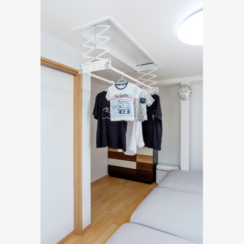 元客間スペースを寝室にリノベーション。リビング~DKから繋がるウォークスルークローゼットからも出入りできる(収納をご覧ください) 電灯式の天井埋込室内干しユニットを取り付け、外に干せない時や、さっと取り込んだ時の一時掛けにも便利。