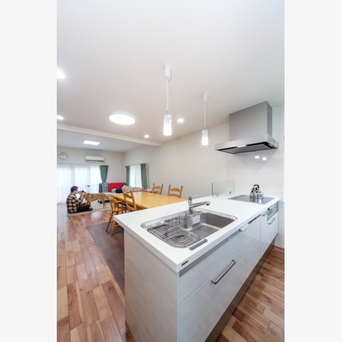 例えば勝手口の土間を床に取り込み対面キッチンを設置するスペースを確保。これにより家事動線が短く、リビングダイニングにゆとりをもたらしました。