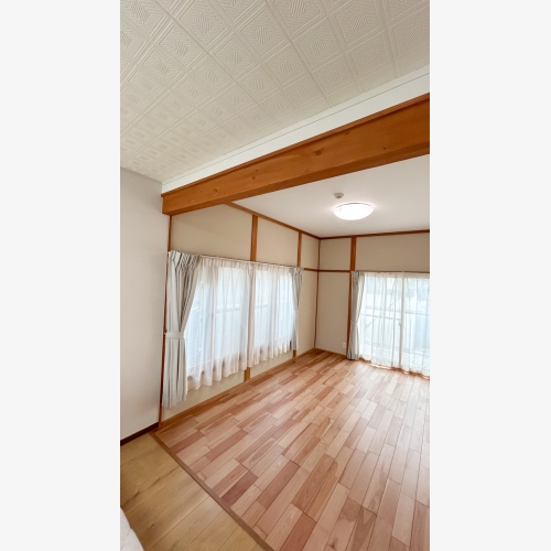 障子と壁で仕切られた和室とDK。間仕切りをとって化粧梁で補強。 天井は解体しホ゛ート゛貼・クロス仕上げに。Before写真右にある押入れの襖は壁にし、反対にある寝室から使うクローセ゛ットにしました。壁はじゅらくをはがして珪藻土を塗っています。 珪藻土のやわらかな色合いと風合いで、やさしい空間に仕上がりました。